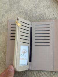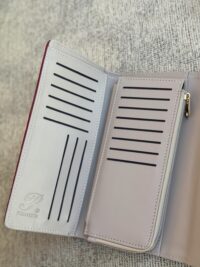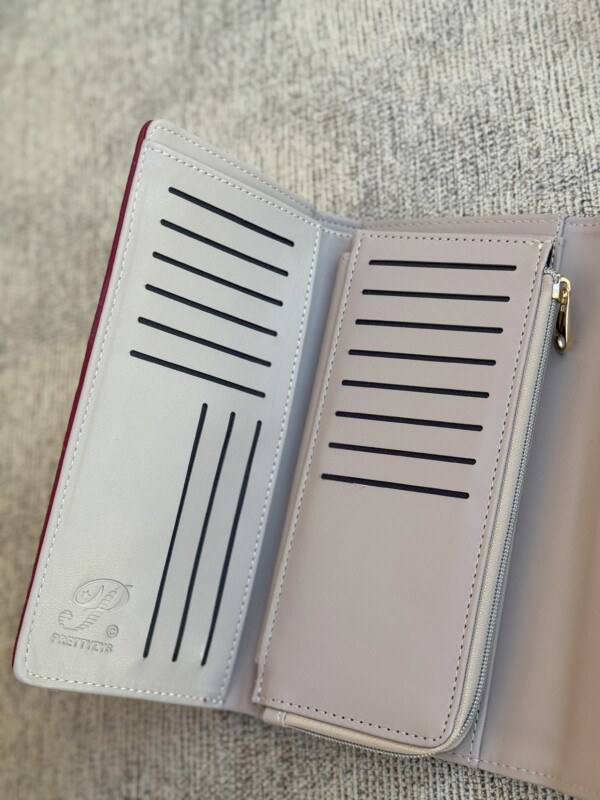 فضای داخلی منظم کیف شامل جای مخصوص ۳۲ کارت، فضای جدا برای اسکناس و یک جیب زیپدار به همراه محل کارت ویزیت یا عکس است.