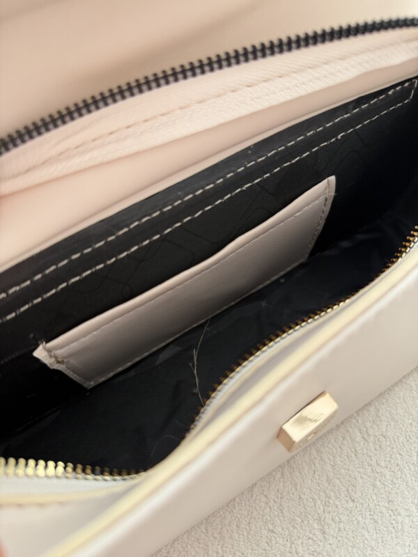 قفل این کیف رنگ ثابت بوده و با دکمه زیر آن باز میشود. فضای داخلی شامل یک بخش اصلی جادار به همراه یک جیب زیپدار است که امکان نظمدهی بهتر وسایل را فراهم میکند.
